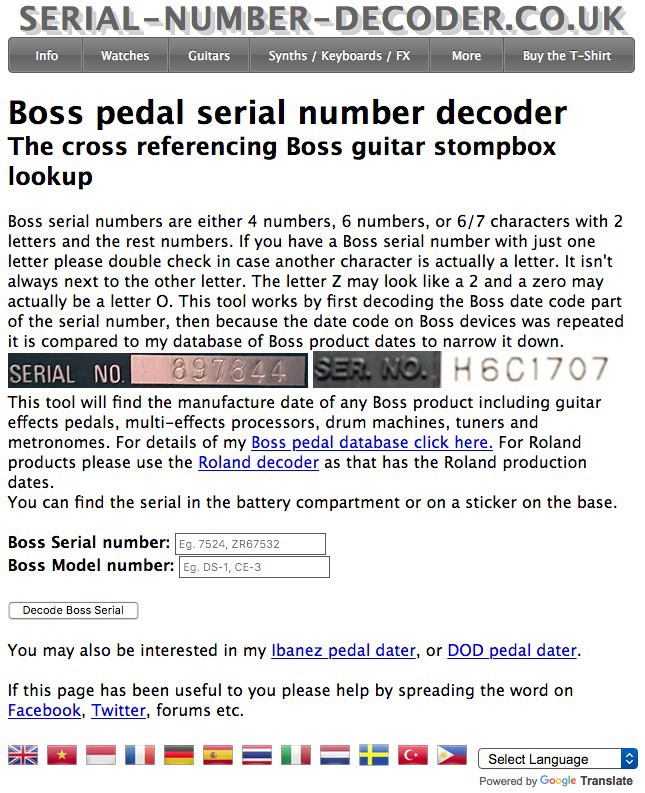 ![]() With this page I will endeavor to help you identify which Boss Pedals can be modded with my kits and which ones cannot. I’ll resist stating the advantages or disadvantages of both. Use the serial number decoder on the right of this page to plug in your pedal’s Serial Number. When putting in the letters/numbers, NO SPACES. Use that date and the info below to determine whether the pedal is thru-hole (modable) or Surface Mount (Not Modable). Boss DS-1 The early manufactured Black 40th Anniversary DS-1s are modable thru-hole circuits, but a buyer just notifed me (10-20-2022) that they are now surface-mount. So you'll need to look at the inside of these to see if they are modable. Surface Mount Started in 2016. Boss BD-2 - Surface Mount Started in 2017 Boss SD-1 - Surface Mount Started in 2019 WAZA - All WAZA versions are Surface Mount and cannot be modded. If you have more info you feel would be helpful, please contact me at tvon@monteallums.com and I will add it to this page. |